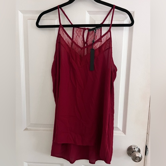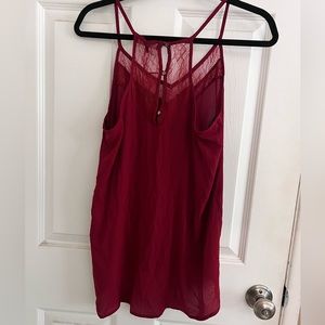 Beautiful red & lace blouse top. Spaghetti strap. Buttons down the back. High-low