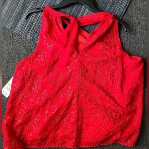 by Sofia Vergara stretching helter top eyelets, botanical floral details and tie back at the neck, adjustable sleeves.
