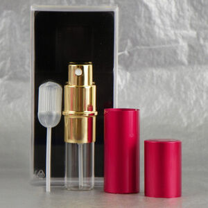 Take your perfume bottle on the road! Well, a miniature version. This classy red sleek perfume sprayer holds about 2 fl oz, or about 60 sprays. Easy to fill and comes with its own pipette (which acts like a turkey blaster). The mouth is big enough to spray directly into the glass container.