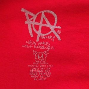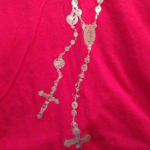 Red short sleeve tunic with gold rosary printed on it.