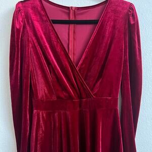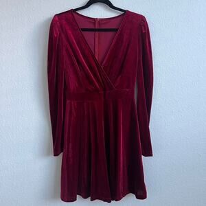 Red velvet mini dress with long sleeves and V-wrap neckline, perfect for the holidays & Christmas! Super cute and flattering on