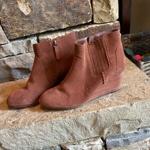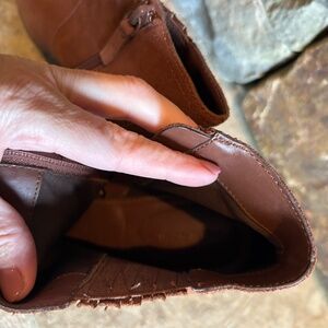 These leather wedges are super cute and comfy! A reddish- brown color. Gently pre loved