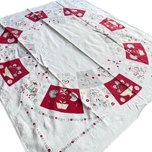 Vintage Red & White printed cotton tablecloth - nearly square and covered with a fun novelty print in the style of Amish or Pennsylvania Dutch design. The motif includes a series of colorful blocks and detailed borders. Sadly there are some minor condition issues: several tiny holes in one corner (see pics) and a few light stains that are difficult to see but are flaws. Still usable and so cute!