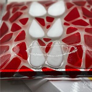 Fused Art Glass Abstract Plate Geometric 9"x9" Red white. Fluted edge. Very good +condition no chips or cracks. Red glass.