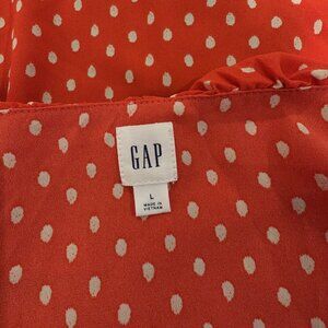 This blouse is so, so cute! Wear on its own, or open as an over shirt, and it's beautiful either way. Hook & eye at cleavage, with cross over button at waist. Ruffled around collar, at waist and on each elbow length sleeve. Orangey Red with white polka dots, from Gap.