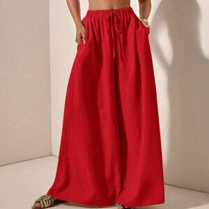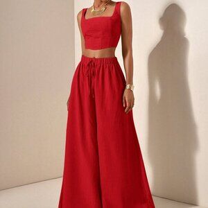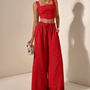 Red womens crop top & flowy wide legged pants textured fabric coord set
