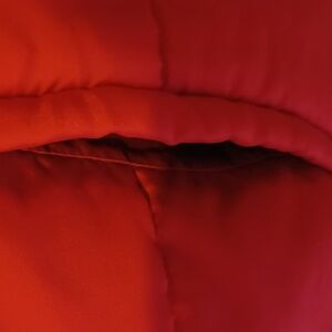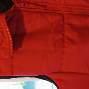 Red puffer vest by Kim Rogers. It doesn't have really thick puffing but is more medium in thickness. The color is more of a brick red instead of the brighter red that is reflected in the photos. The front zips and the collar can be worn down or up for more coverage on colder days. Length 22 1/2 inches x 22 inches wide