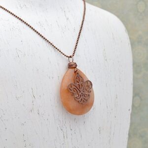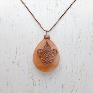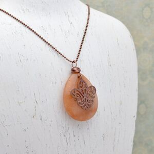 A teardrop Red Aventurine stone is wrapped with antiqued copper wire and adorned with a filigree Fleur-de-lis charm to create this lovely pendant.
