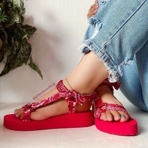 Red Kick @ss style, bandana print velcro strap with foam bottom super comfy to wear for long hours. Velcro is adjustable to the ankle and foot size. Welcome wide feet. Definitely a streetwear style. More colors in my closet.