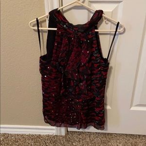 A red/black blouse with a ruffle down the middle. Has a tie at the back behind the neck. Silver dots are patterned across the shirt. NWOT! The tag says L, but it fits like a M.