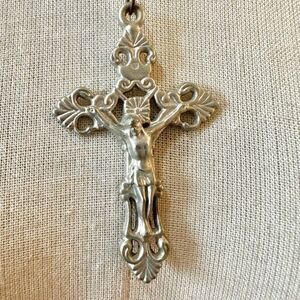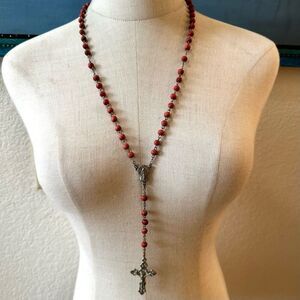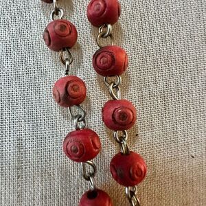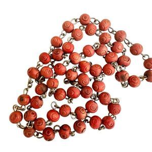 Red CARVED WOOD beaded SILVER TONE ROSARY