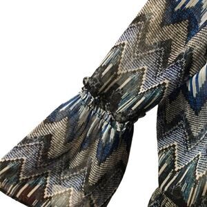 Flirty fun mini dress cover up shades of blue sheer top with elastic around neckline can be worn tied and off the shoulders , bell sleeves,  elastic waist with lined tired skirt in excellent, like new condition size M fits 8/10 measures flat 18" pit to pit