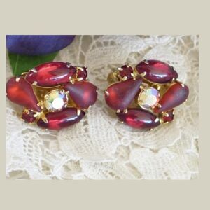 BEAUTIFUL PAIR OF VINTAGE 1940'S RED GLASS CLIP EARRINGS, THESE ARE SO PRETTY AND SO WELL MADE THAT THEY COULD BE AN UNSIGNED DESIGNER , THEY HAVE UNIQUE PEAR SHAPED PRONG SET MATTE GLASS STONES MIXED WITH SHINY RED GLASS OVAL STONES AND THEN A CENTER SHINY AB PINK CRYSTAL STONE, ROUND..THERE ARE 2 SMALLER RED ROUND STONES ALL PRONG SET.. THE EARRING IS SET INTO A SHINY GOLD PLATED SETTING AND IS IN VERY GOOD CONDITION THE CLIP WORKS VERY WELL . SHIPPED IN A GIFT BOX.