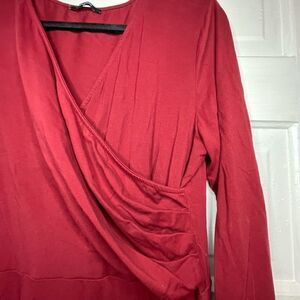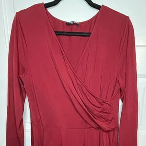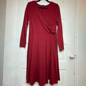 Red Cotton Long Sleeve Plus Size V Neck Dress