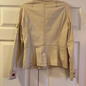 This jacket seems to run smaller than average extra large. I would guess it to be more like a medium. Please see measurements before purchase. Like new condition and smoke free/pet free home