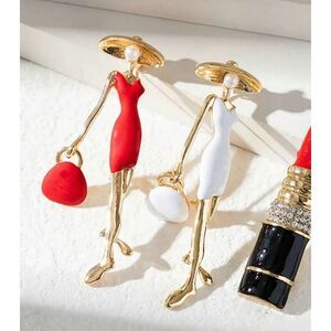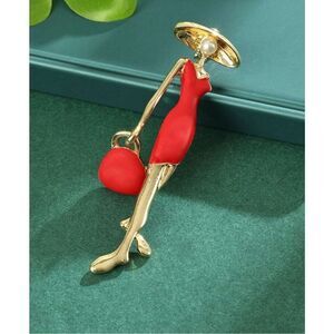 Adorable lady in red brooch with red enamel dress and purse accented by gold and a pearl. A fun and whimsical addition to any outfit.