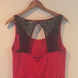 Red dress with black lace detailing on back. It has pockets!! Size large. Purchased from Lord and Taylor.