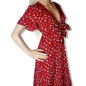 This is an adorable floral, red dress with bow that ties creating a key-hole front:) This dress also features Ruffled short sleeves and lace lining along the neckline :) It is a size Large, I just have it pinned back on my mannequin so it fit correctly, it is true to size, though 😊