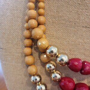 The necklace has three strands of beads, each with a different color and size. The top and bottom strands feature tan-colored wooden beads of varying sizes, while the middle strand alternates between smaller gold-colored beads and larger red-faceted beads.