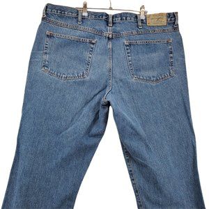 RedHead Jeans for men with a straight leg design, utility pockets, and size 44x32. The jeans are blue denim and made of comfortable, durable cotton.