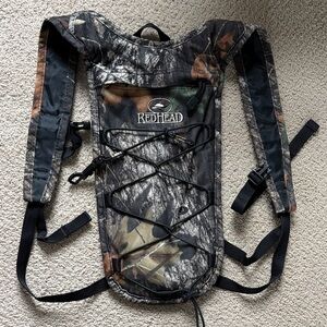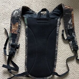 Durable backpack with a multi-color camo pattern. Ideal for outdoor activities. Features adjustable straps and secure front lacing. Can also hold Camelbak Hydration Water Bladder -NOT INCLUDED