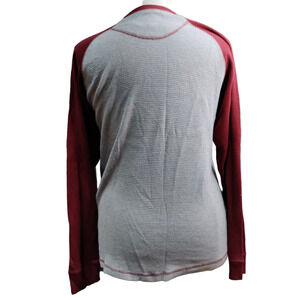 LIght weight sweatshirt, perfect for the fall. Maroon sleeves and stitching on gray pullover. Measurements of sleeves is 33" from shoulder to cuff, 24" front length from collar to hem and back shoulder to shoulder is 22".
