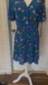 This mid length floral dress in cobalt blue buttons up the front, features a v neckline with ties on the sleeves and ties in back.