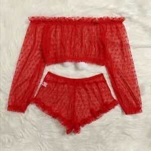 Super Cute and Flirty Red Lace Off the Shoulder Top and Matching Lace Sheer Underwear Set