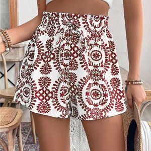 Cute retro shorts with a dark red (some photos are making it look brown, but it’s red) print all over.