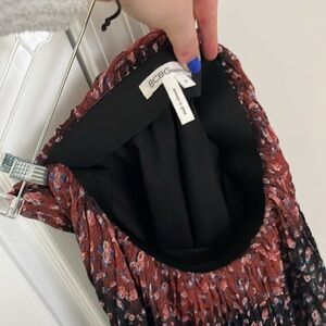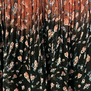 Red and navy floral print mini dress. Slightly sheer patterned layer with subtle pleats, and under a black skirt lining. All around elastic waist. Size medium, in good condition.