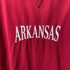 .This Red Oak Sportwear Arkansas t-shirt is a great choice for fans of the Razorbacks. It is made from 100% cotton and is screen-printed with the classic Razorbacks logo. The shirt is in gently used condition and has no major flaws. It is perfect for game day, casual wear, or to show your Razorbacks pride.