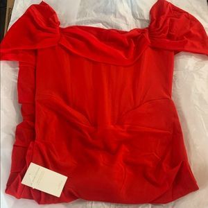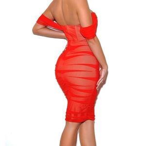 Perfect for the season, our Semi-sheer red Weslee is cut from our signature stretch crepe. Fully lined and ruched throughout the body, this style accents and sculpting your figure. Elegant any way worn, Wesley sleeves can be placed on or draping off the shoulders. Similar to House Of Cb dresses.