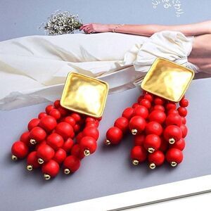 These vibrant Zara earrings are a stunning example of how bold color can elevate a classic design. Featuring a hammered gold-tone square top, these earrings cascade into multiple strands of bright red beads, creating a striking and lively effect. The deep red hue of the beads contrasts beautifully with the textured gold, making these earrings perfect for making a statement with any outfit.