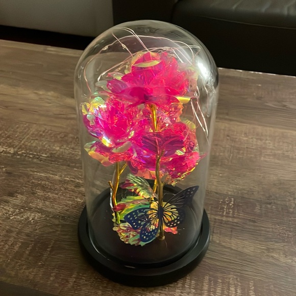 Red-Pink Light Up Roses in a Glass Dome surrounded by a string of LED lights, powered by 3 x AAA batteries (batteries not included), adding a magical touch to the rose. When light hits the roses from different angles. This three-rose arrangement makes a more powerful, heartfelt statement.
