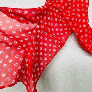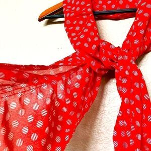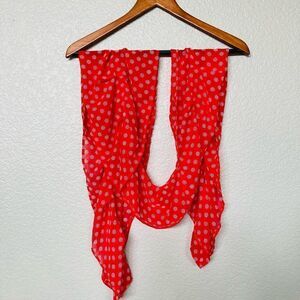 Excellent preowned condition lightweight sheer red and white polka dot print neck scarf. Clean nonsmoking home. Could be worn around the neck, waist, or as an accessory for a purse. Has a slightly ruched gathered seam along the middle. Approx 64" x 10".