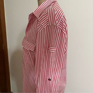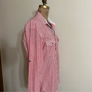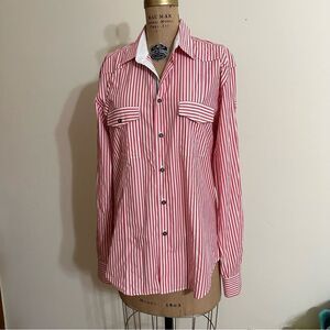 Red and White Striped Zara Man Tailored Fit Long sleeve Shirt size 16” collar, fits Medium large. Optional contrasting turn back cuffs matching inside of collar. Sleeves can also be rolled and buttoned back to elbow length. Functioning small pocket on one upper arm and patch pockets on chest. Great condition save for a small mark on one cuff I haven’t tried to remove .