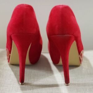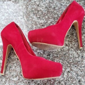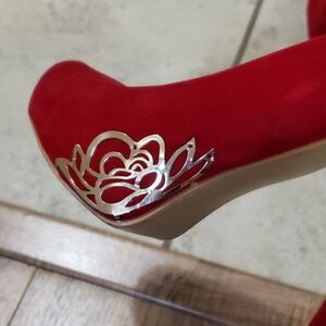 #red #heel #platform #women #8 #sexy #accent #gold #pre-owned #feminine #unique #suede #textured #colorful #bold