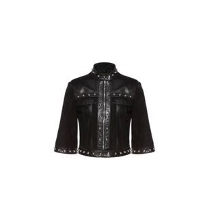 Cropped 3/4 sleeve suede jacket with leather inserts , adorned with metal spheres around the edges