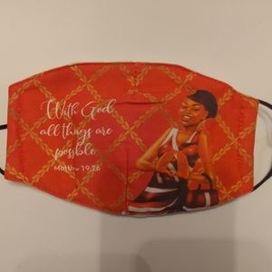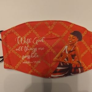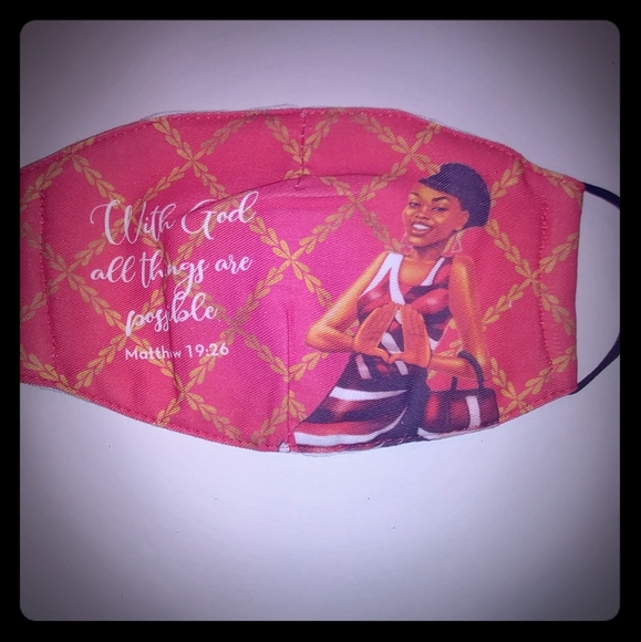 New, 100% cotton face mask, with adjustable ear loops. Size 5x1 inch x 5x7 inches. Filter included. Washable, quilted backing. Matthew 19.26