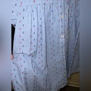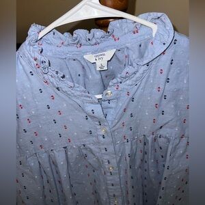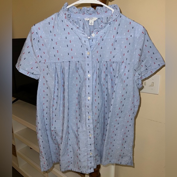 Chic light blue blouse featuring a button-up design. Adorned with red/white/blue accents. Perfect for a Fourth of July cookout!