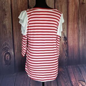 Pretty Red & White striped cold shoulder 3/4 sleeved blouse. It has stretch to it. Cute ruffle at shoulder.