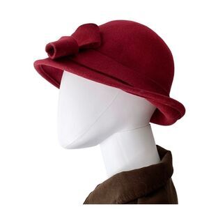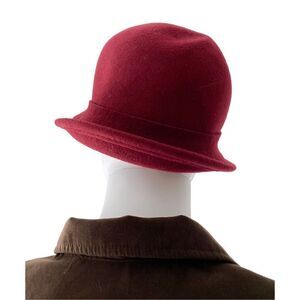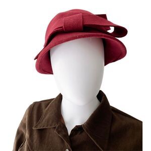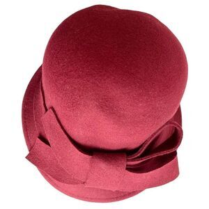 Red 100% wool felt cloche hat with Felt bow. One size. Adjustable string in grosgrain ribbon sweatband. Max sweatband dimension=22”. Good condition.