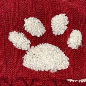 Red and White Cable Knit Christmas Stocking with Paw Print and Pom Poms