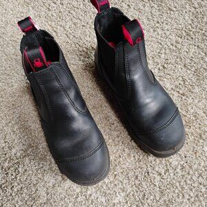 Black Redback slip-on duty boots with steel toes and a scuff guard on the toes. Size 4.5 UK (US Women's 7, US Men's 5.5).