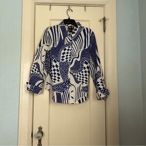 Redd Jeans Abstract Blue & White Button-Up Sequins Long Sleeve Cotton Size 10