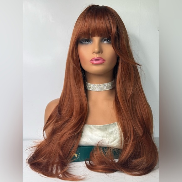 Reddish Copper Long Wavy natural Synthetic Fiber Full Wig With Bangs for dai…