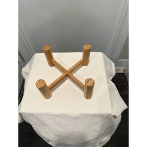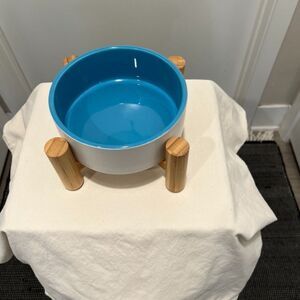 White Ceramic dog bowl with blue accent w/ Bamboo Stand.