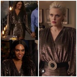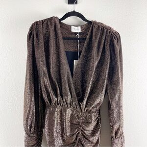 Surplice v neckline, padded shoulders with pintuck details, long ruched sleeves, fitted mini skirt, loose relaxed fit top, mid weight slightly stretchy fabric. True to size. Bronze - metallic brown. Cocktail, party, event, night out, semi formal, wedding guest, date, evening, gala, holiday, Christmas, New Years Eve, fall, winter, shimmery, sparkly, glittery, official. Size 46 / XL. As seen on the Bachelorette and Dynasty.