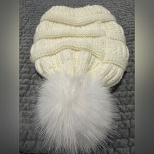 Redess Creamy white (ivory) Knit Beanie Hat with Faux Fur Pom – Soft & Cozy