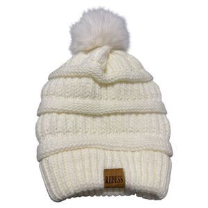 Redess White Knit Beanie Hat with Faux Fur Pom – Soft & Cozy